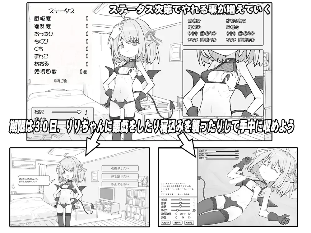 ▽游戏概要 目标是在30天内勾引莉莉。 在此之前如何去诱惑她则取决于你。 用自己的双手打败厚脸皮的魅魔!
