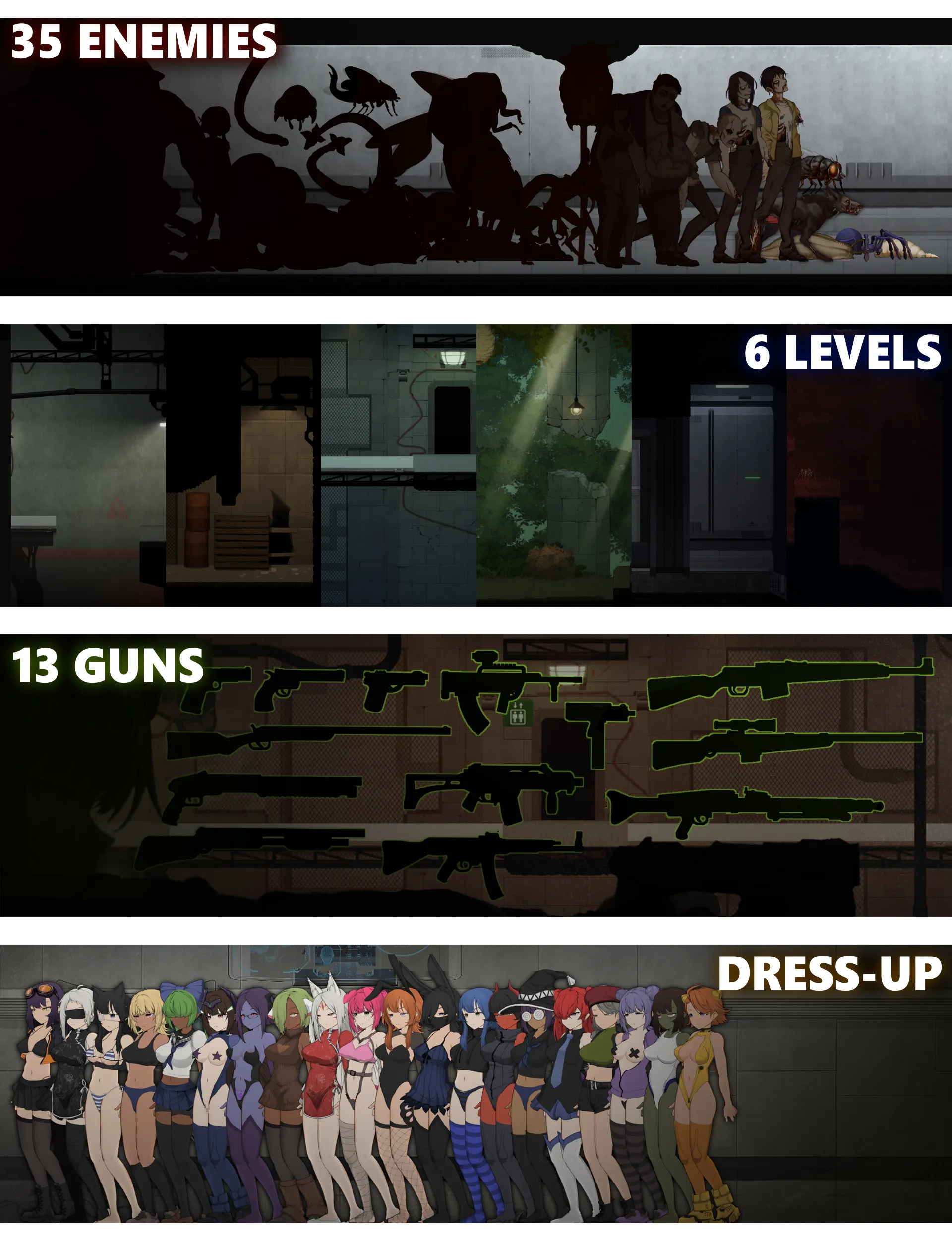 感染者(僵尸)、变异昆虫、触手、寄生虫、外星生物等,登场敌人超过35种。所有敌人均搭载使用Spine 2D制作、滑腻动态的多阶段H动画。