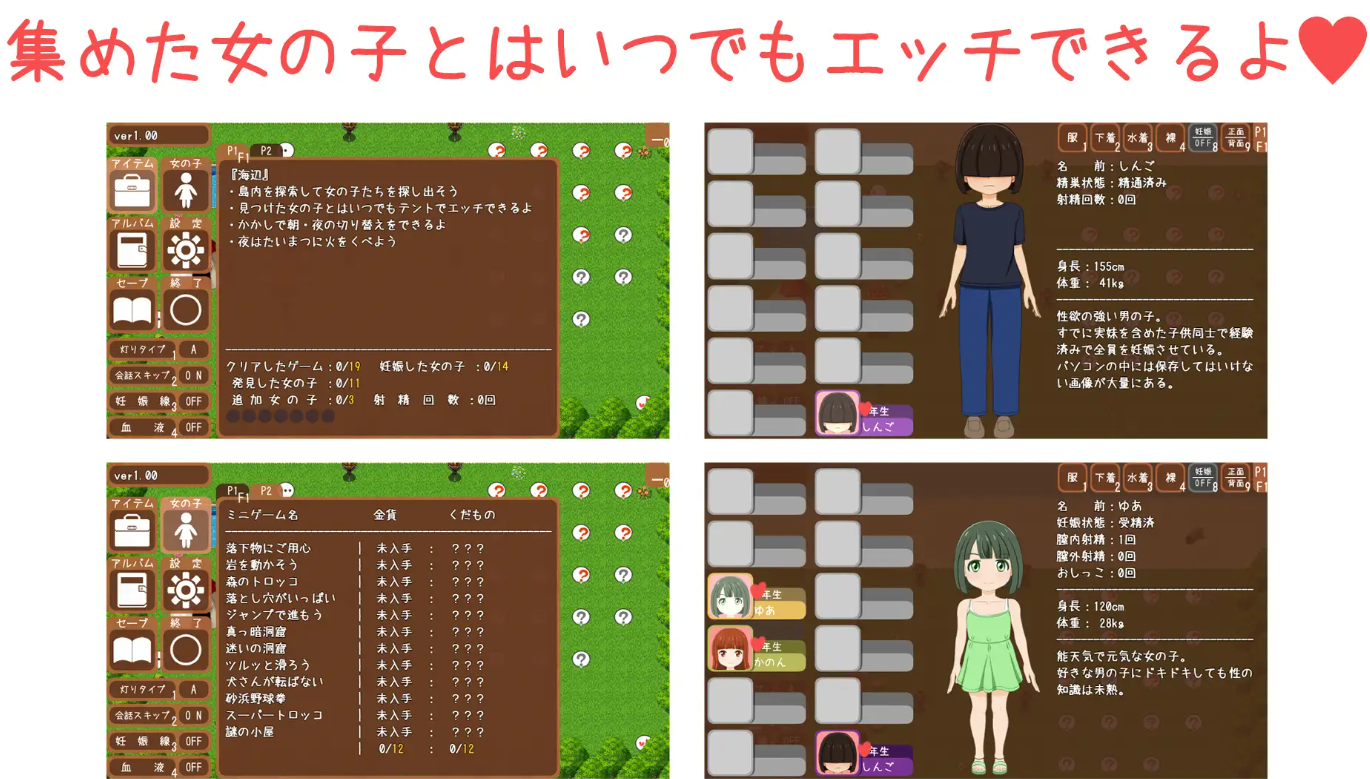 这是一款主人公男孩来到名为孕育之岛的岛屿后,寻找先一步参加仪式并已在岛上的女孩们,与她们进行爱爱的游戏。