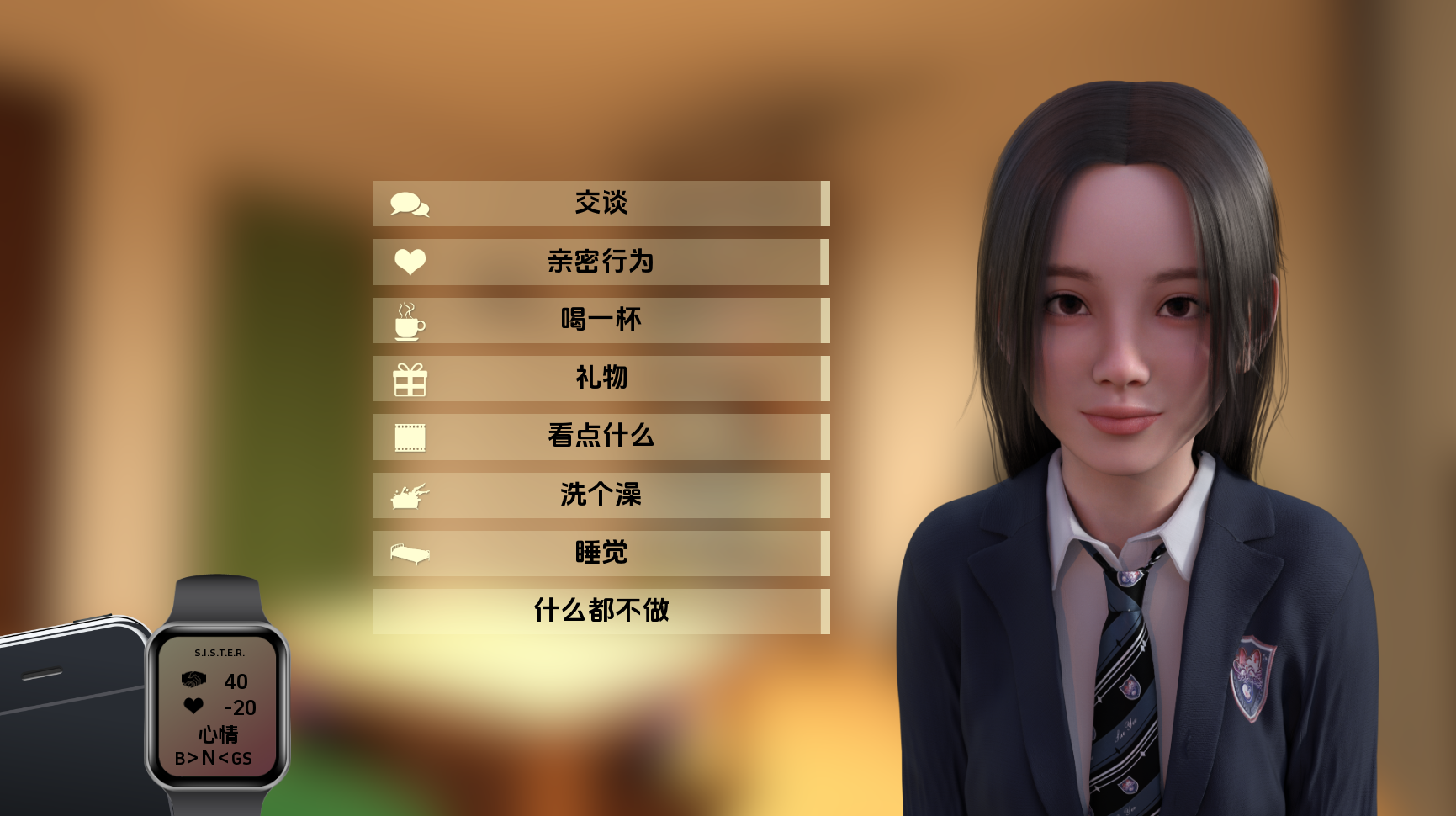 你们同居在一间小小的单间公寓里。在这个你们会共度很多时光的小空间里,你们必须和睦相处。通过与她的互动,你们会建立起一种基于信任、友谊…… 以及更多情感的关系!和她聊天,了解她最喜欢的话题,一起玩电子游戏,带她进行一日游。通过你的行动,她会更加信任你,当然,你也能让她对你产生性吸引力。但要注意!你也可能会失去她的信任。