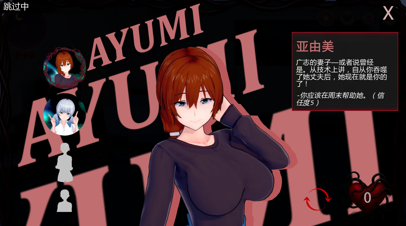 ・胜美(Katsumi)的好感路线已添加:和往常一样,没有新动画,但这条路线更侧重于剧情。实际上,我得修改大量代码才能做出真正分离的路线。这会影响到提示和事件顺序,不像理子(Riko)的路线,我基本上只改了一些对话。另外,我还稍微拓展了一下她的故事。