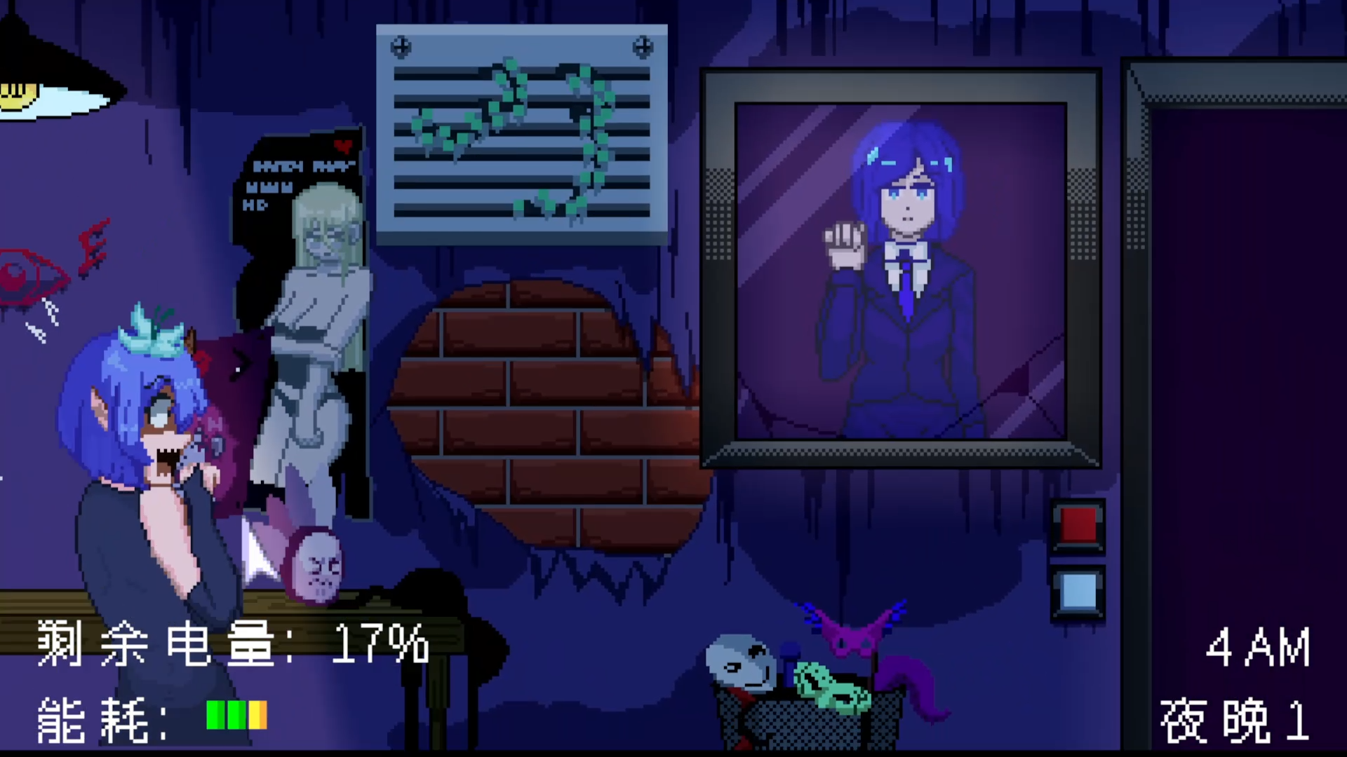 游戏玩法围绕经典的夜间看守机制展开:监控摄像头、管理电力和资源,坚持到早上 6 点。如果失败,你不会死亡,而是会被欲望吞噬。输掉一个夜晚会触发全动画的不适合工作场合(NSFW)场景,在这些场景中,鬼魂会以高度露骨且超自然的方式控制主角的身体。