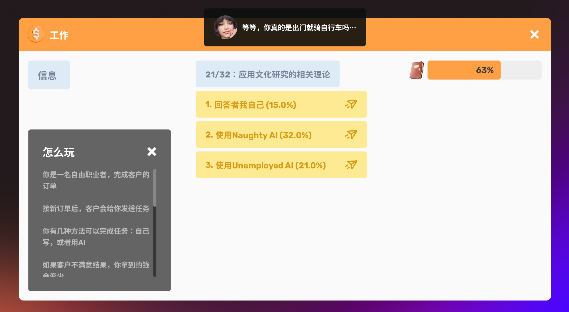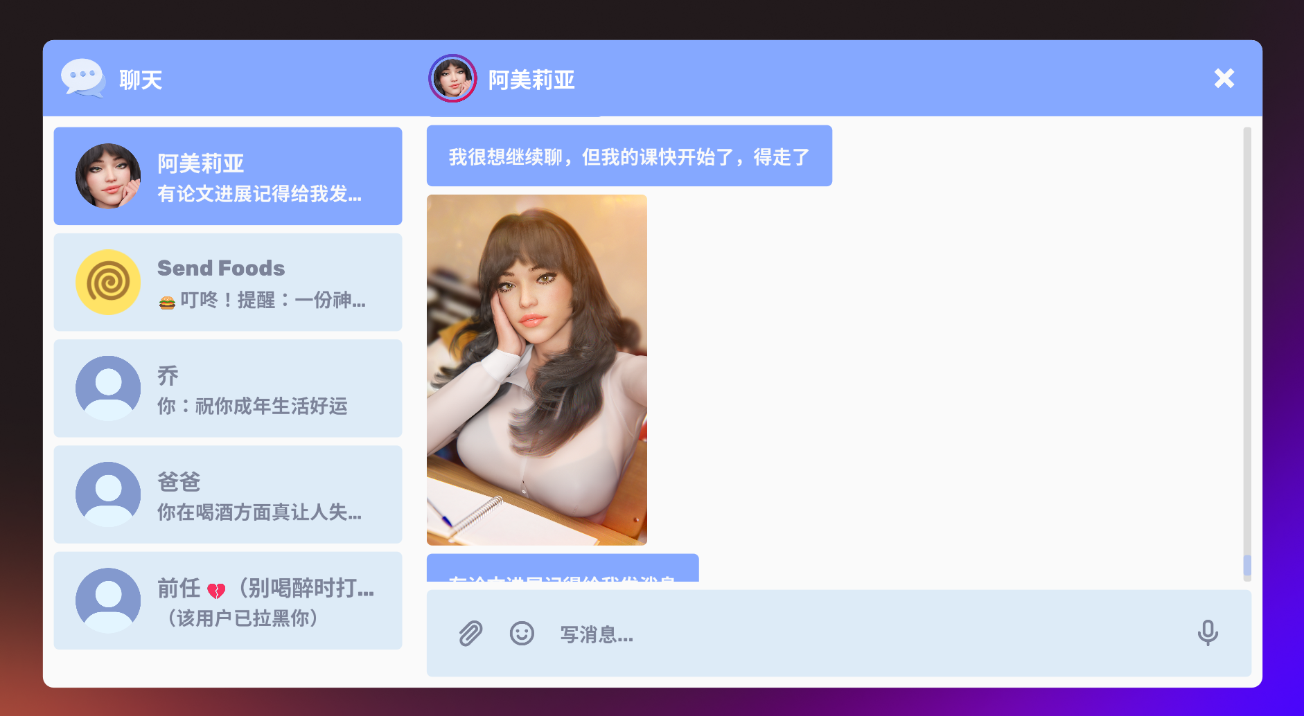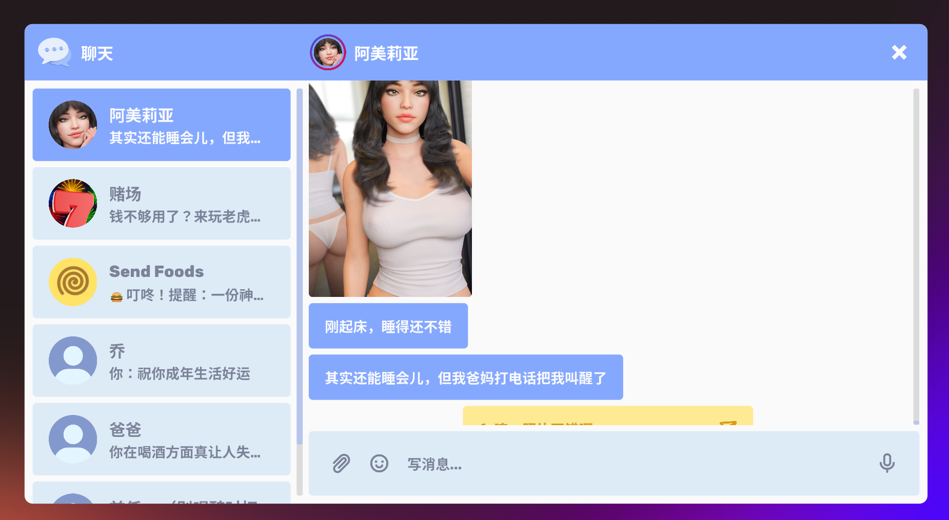 《淘气聊天》是一款聊天模拟器,在里面你可以搭讪一位名叫阿米莉亚的性感又富有的女孩。如果你帮助她,她会给你一份特别的奖励。那么?你还在等什么呢?