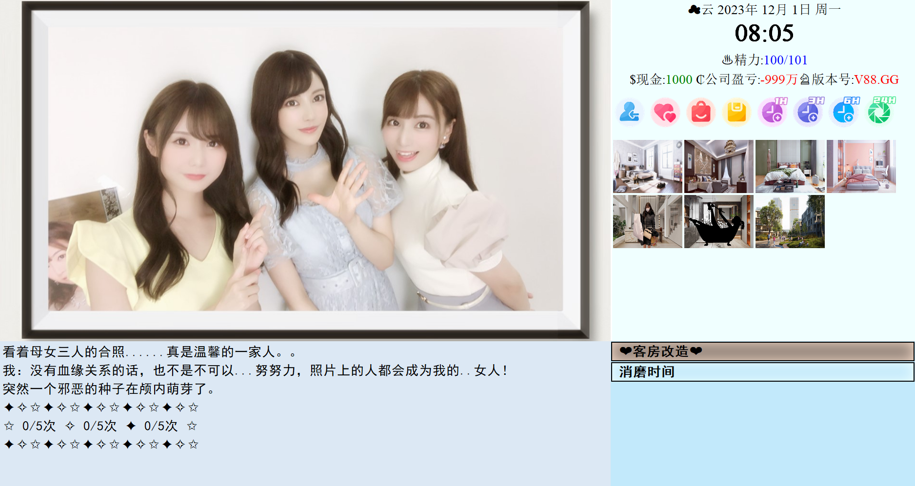 2.翻新了客房(全家福处解锁),好感度>500可邀请住宿,受邀人每日好感度/堕落度自动提升100