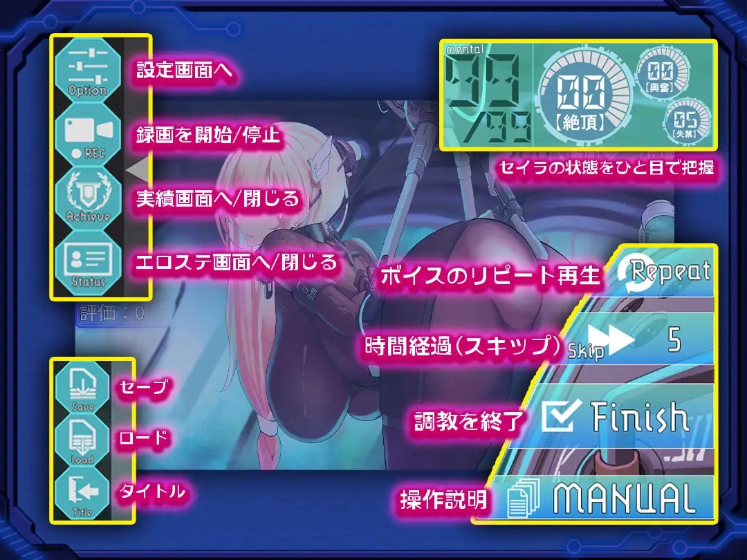 身為調教師的你必須讓塞拉沈溺於快感,直至喪失所有反抗氣力。用痛苦與高潮,用盡一切手段將塞拉轉變為順從的雌獸。