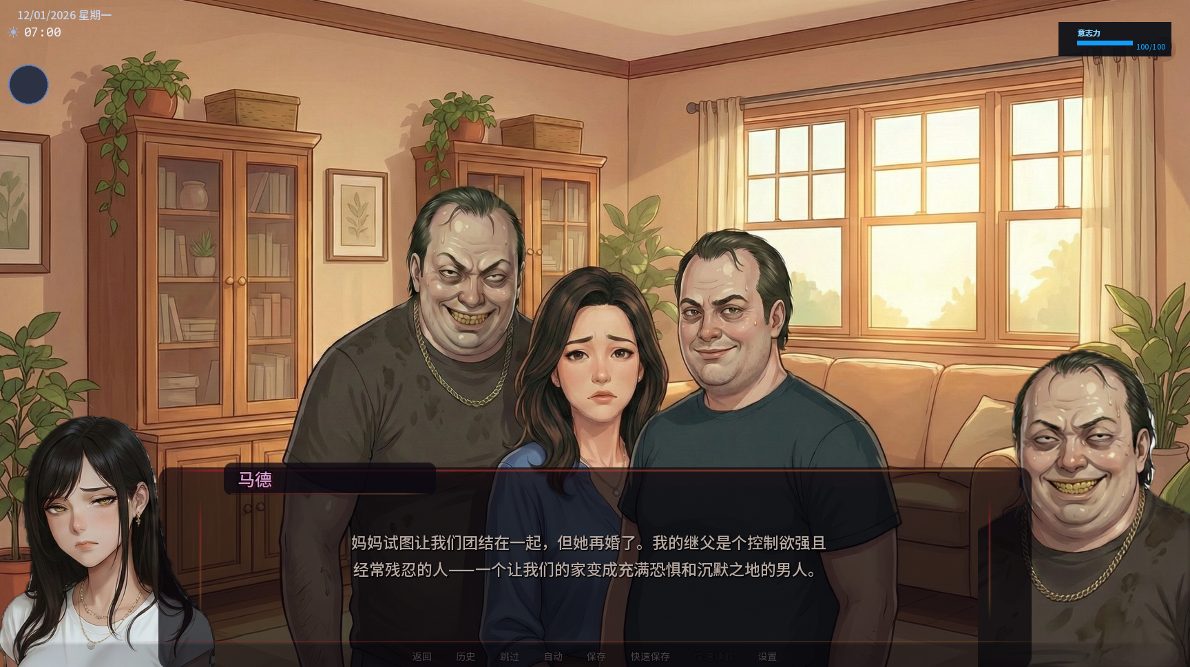 你将掌控 Madd,一个在母亲最近去世后与继兄和继父生活在一起的女孩。你一直梦想成为一名工程师,但你目前的环境并不安全,继家人侵犯你的空间,还强迫你陷入糟糕的境地。因此,你决定离家出走,但你没有足够的钱来支付学费和在良好的环境中生活,所以你把自己伪装成男孩,住进了只允许男生入住的宿舍。在这一切发生之前,你从家里开始,计划逃离你的继家人。