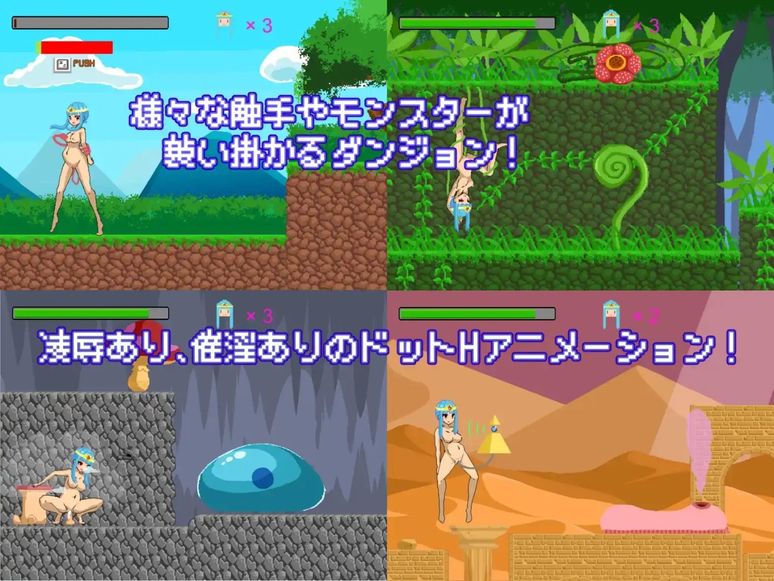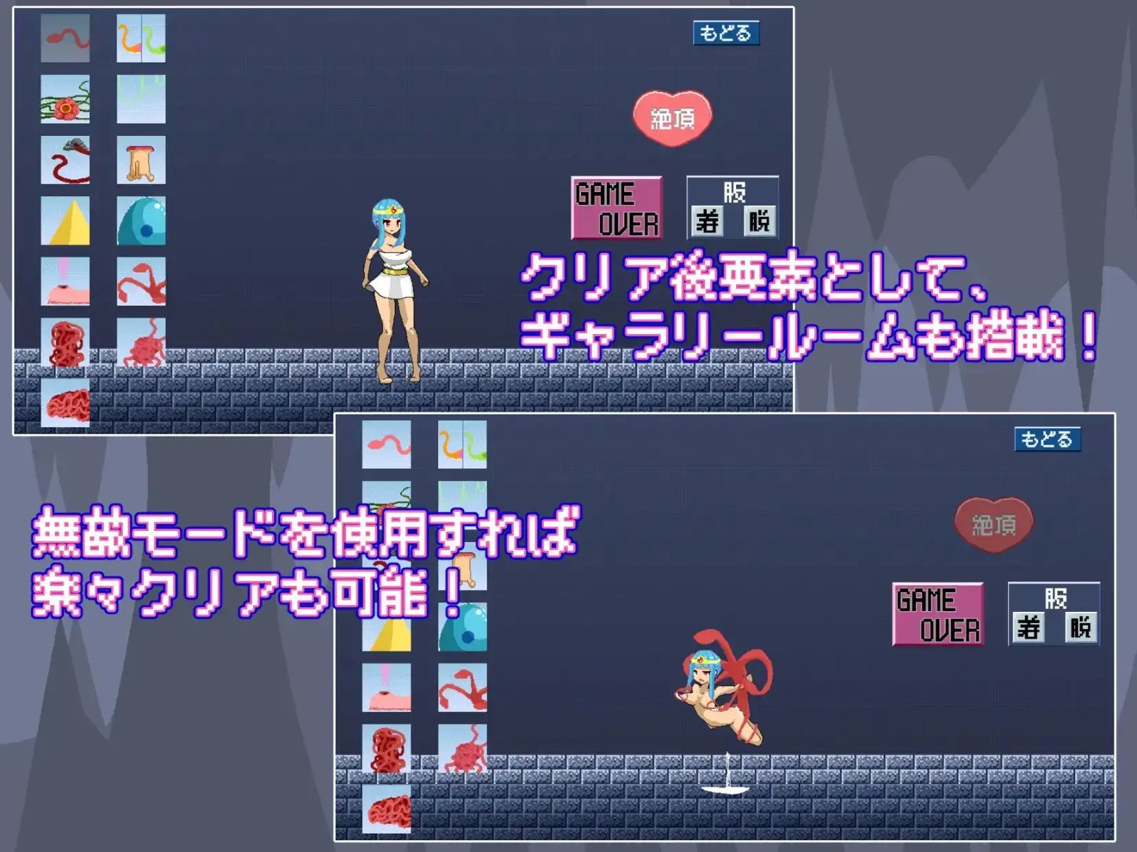 這是一款以觸手等黏滑場景為主要元素的簡約像素風橫版動作遊戲。