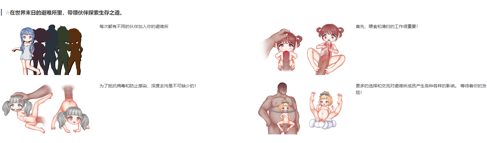 ☆ 在末日世界的避难所中,率领同伴,摸索生存之道。