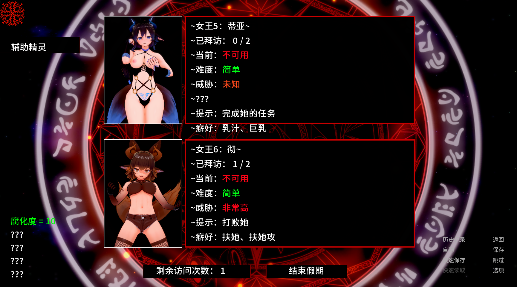 遗憾的是只有 2 个新的女王到访场景。其他的将在下个更新中添加(上一次更新中缺失的女仆场景也是如此)。下个更新将只有一场超 —— 大的战斗,这样我就能在其中加入所有缺失的色情场景了。
