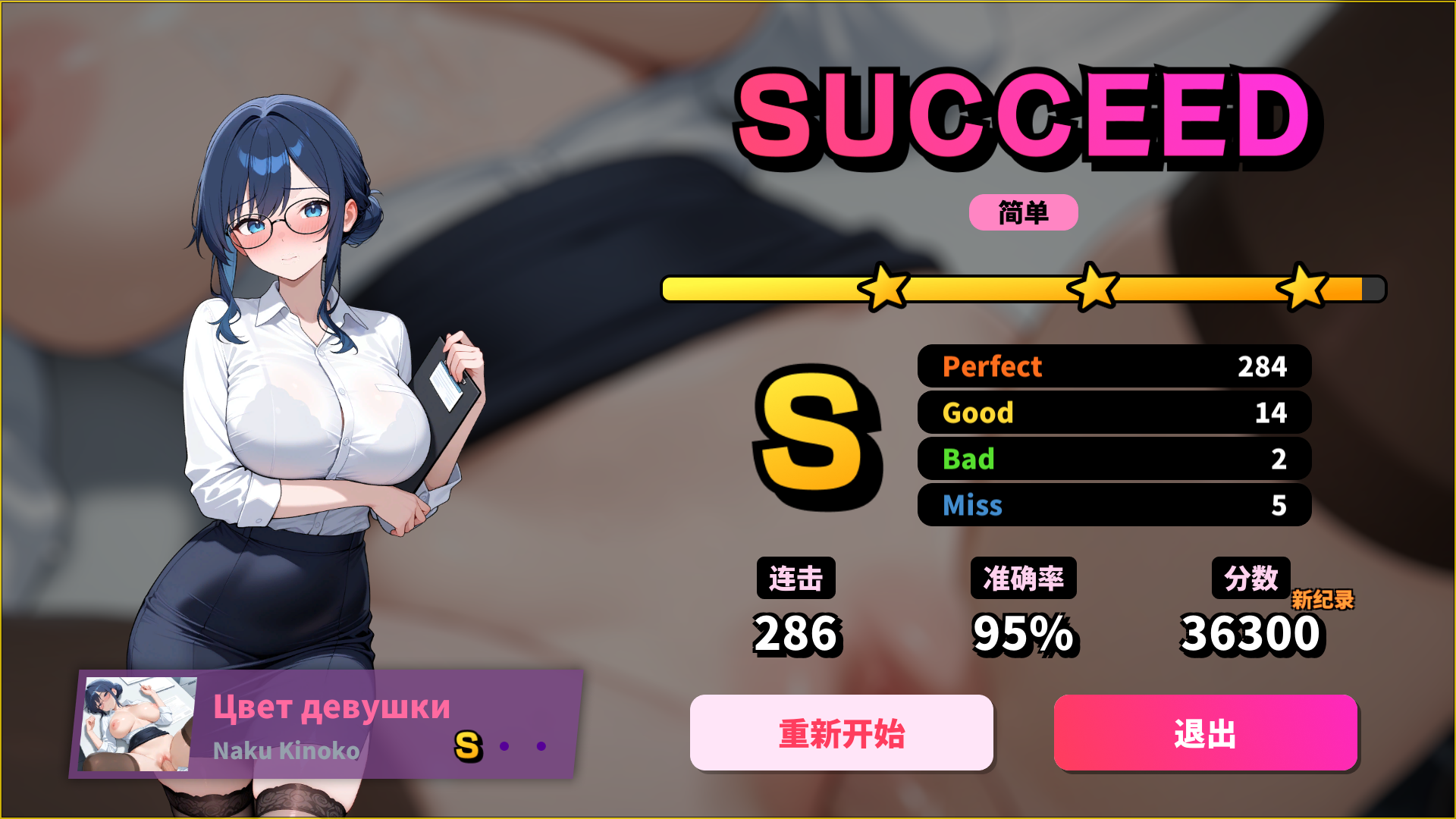 ・惊艳的色情 CG:每首歌都搭配一幅精美的 CG,其中包含从前戏、高潮到中间各个阶段的细腻动画 —— 随着你的连击数增加而不断演变。