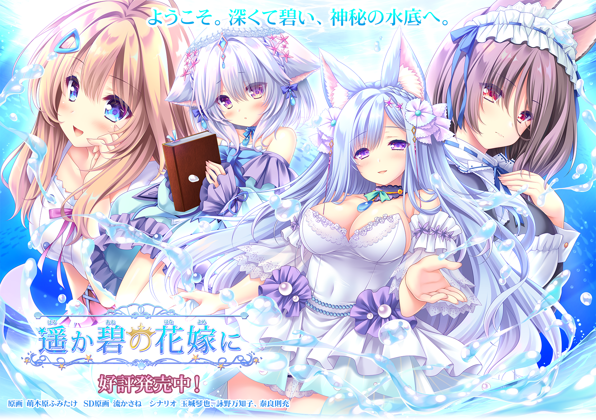 《献给蔚蓝之海的新娘》是一部恋爱题材的视觉小说,玩家在其中扮演遥生。它的大部分游戏玩法都花在阅读屏幕上出现的文本上,这些文本代表了故事的叙述和对话。文本伴随着角色立绘,这些立绘代表了遥生正在与谁交谈。同时画面上会显示作为故事发生地点的背景图像。在游戏中,玩家会在故事的某些情景下遇到特别剧情CG,这些CG显示的时候画面将不再显示背景与立绘。
