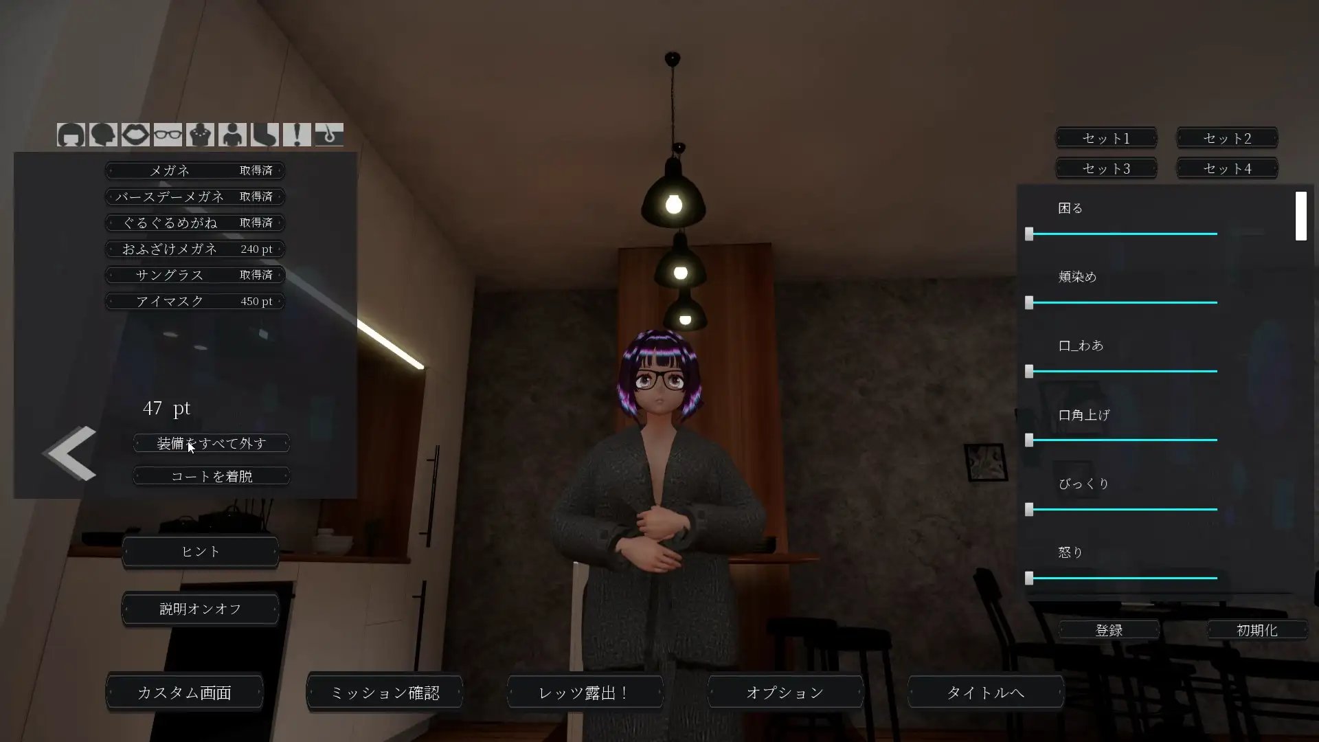 例如在做出雙剪刀手動作時配套阿黑顏,在排泄時表現出羞澀感……在露出挑戰過程中,表情與體型均可實時切換為預設狀態。此外,還可以通過注視鏡頭來營造被強迫的氛圍等,請盡情探索各種玩法風格。