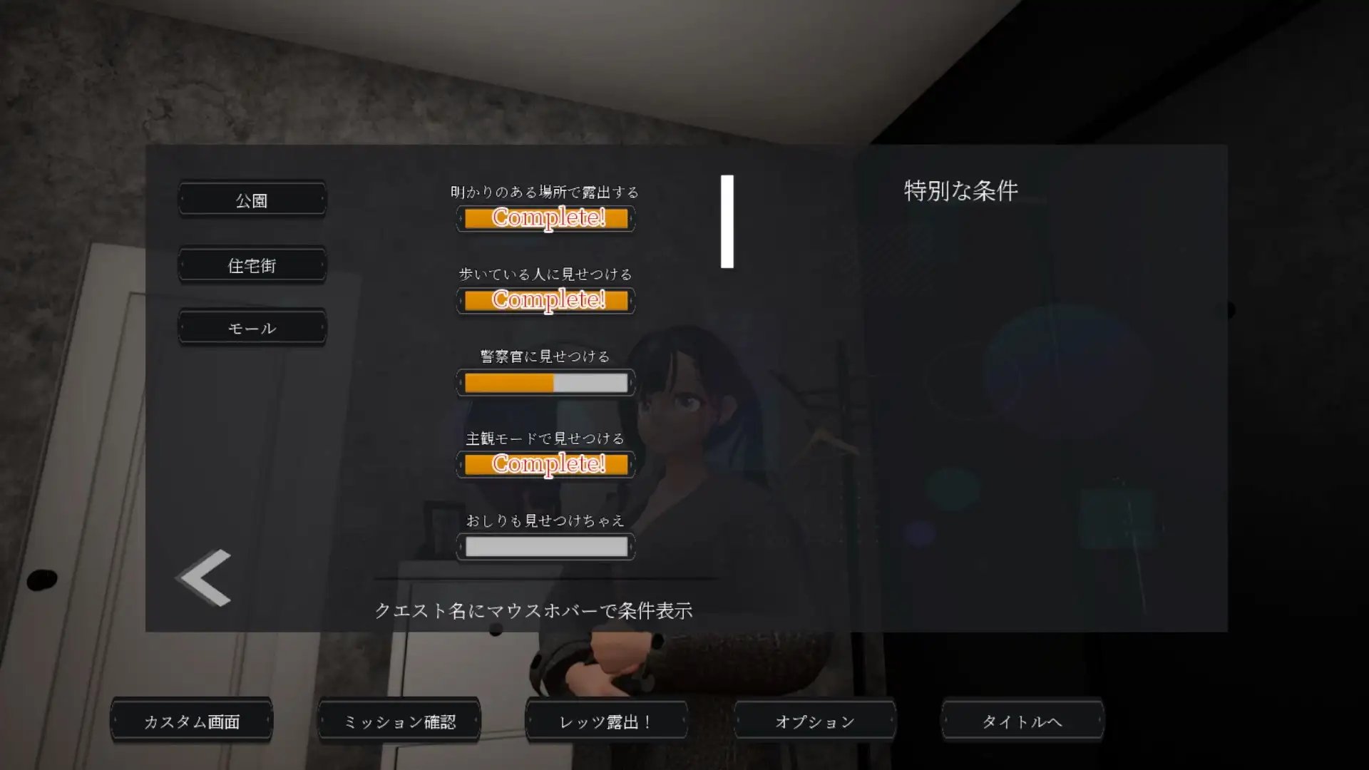 在各種角色面前隱藏身形的同時大膽展示裸體,通過完成重重任務,讓露出挑戰獲得成功!任務種類多達80種以上,除了通用任務外,還包含各關卡的專屬任務。