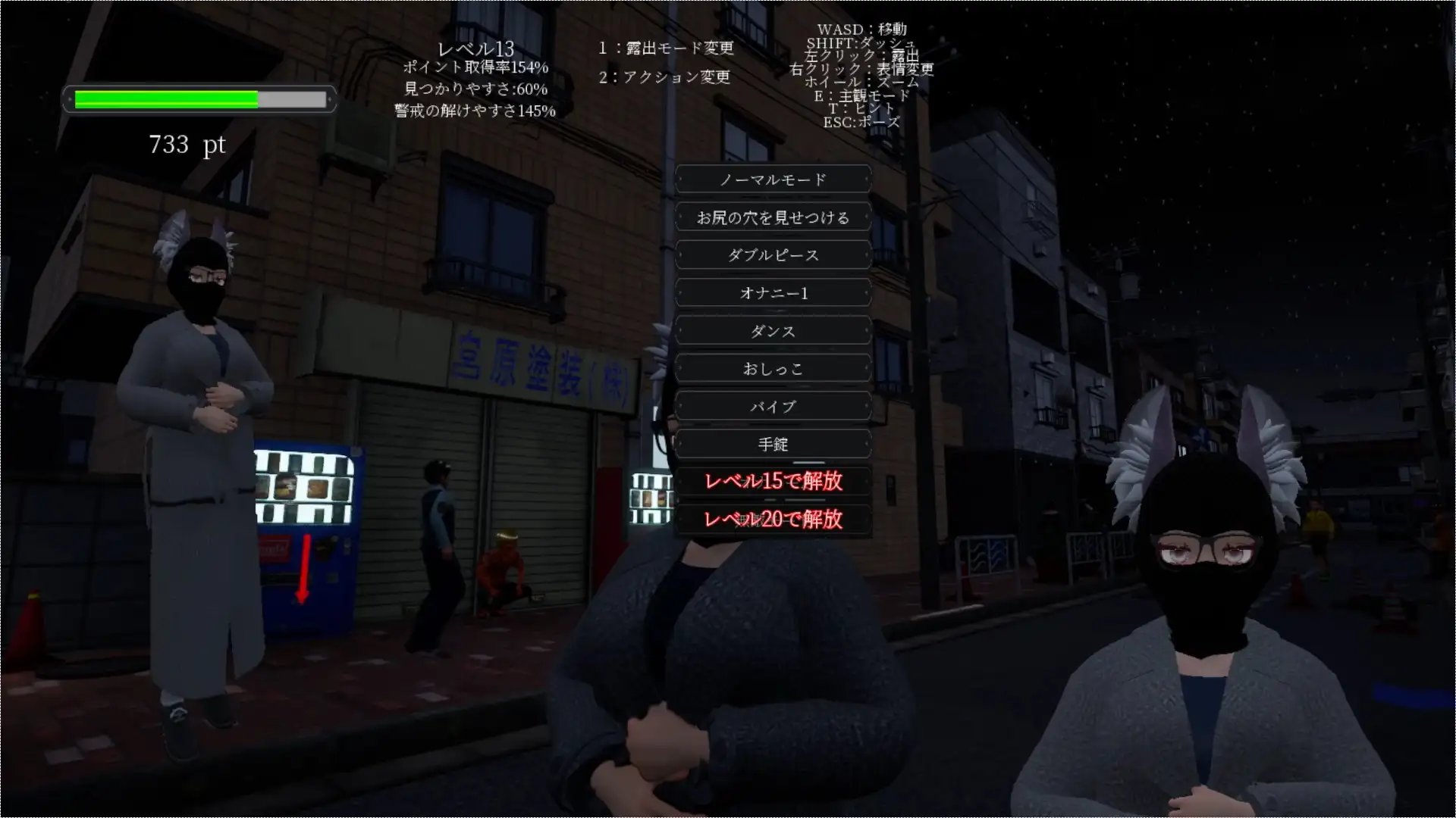 本作不包含被發現後的實戰場景,是一款純粹的露出模擬遊戲。搭載了可以自由露出的無敵模式。支持主觀視角模式。若過度進行自定義設置,可能會導致模型出現崩壞。