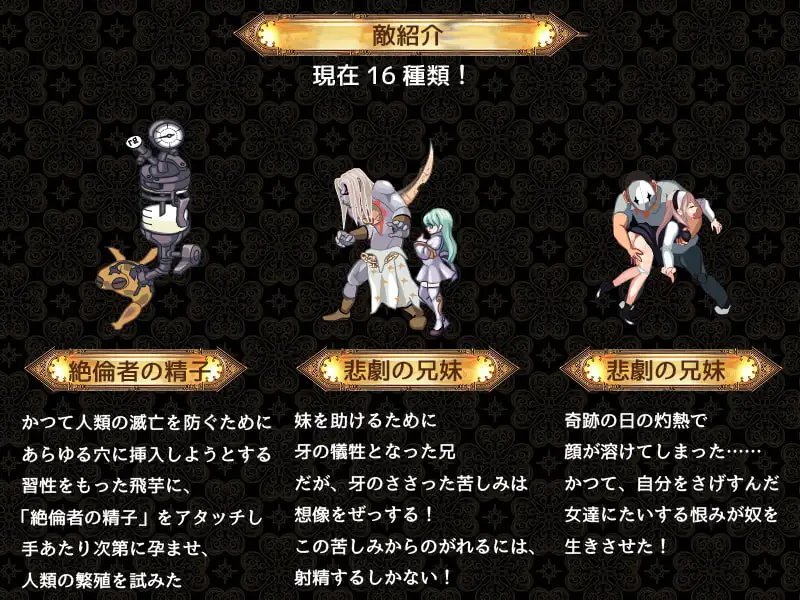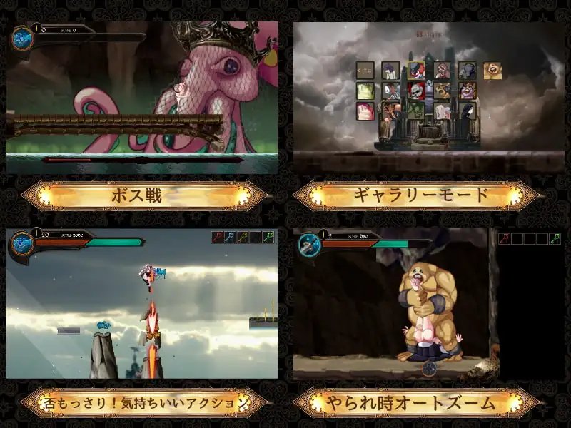 受到敵人攻擊或與之接觸時,★即便處於著裝狀態★也會播放色情動畫。每個敵人均包含:(1)著裝時色情 (2)脫衣時色情 (3)遊戲結束色情三種內容。