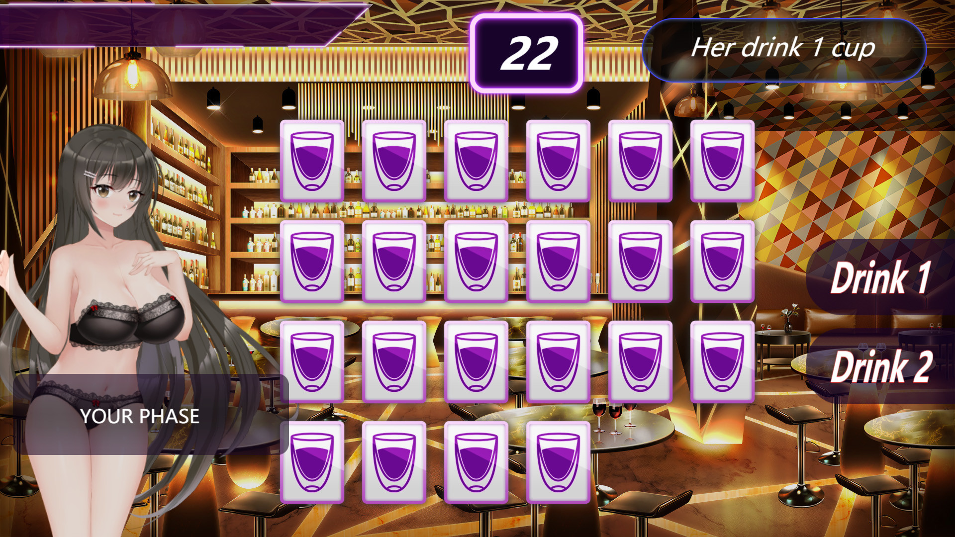 您将通过猜拳或者是划拳,来进入7间酒吧与角色对战,赢了之后还有一个拼酒游戏,只有在赢了拼酒游戏以后才能获得与女孩约会的权利。