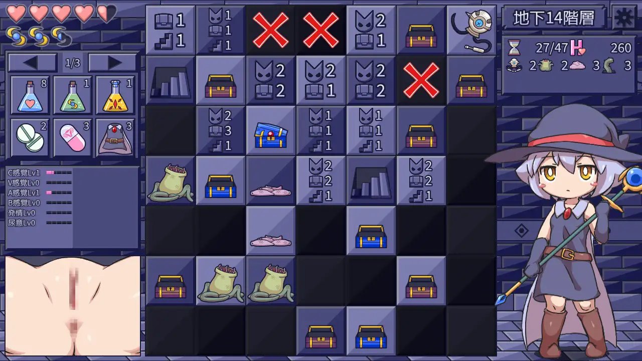 利用各种道具,在体力因过度高潮减少之前,取得地牢最底层的宝物吧!