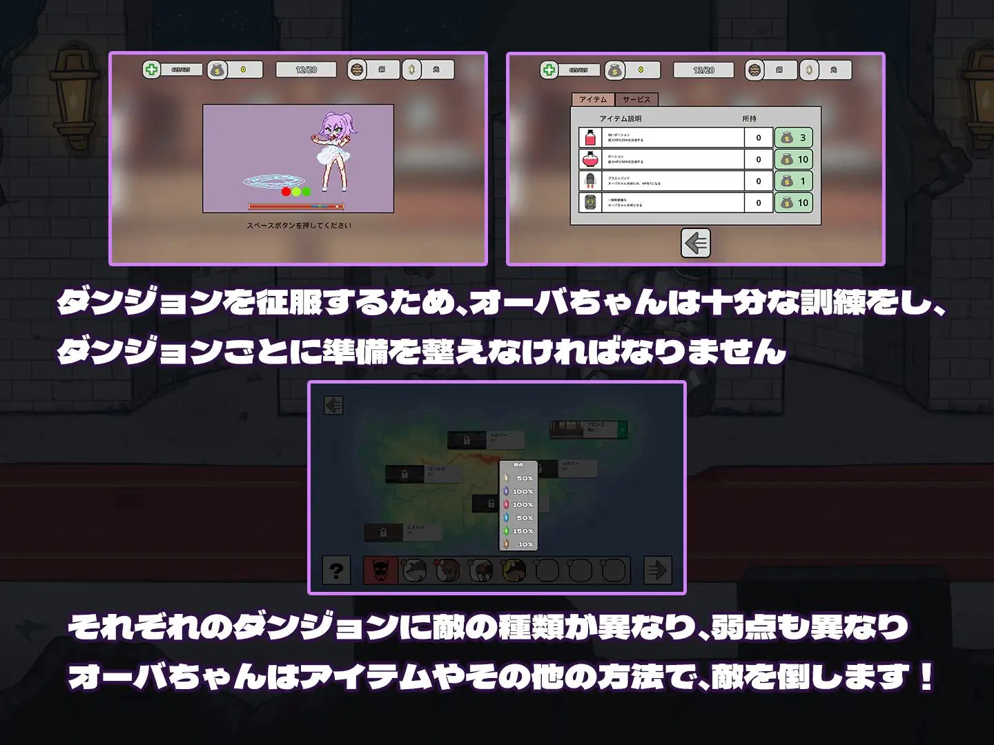 简单的迷宫探索游戏,玩家操纵着大奶奶征服迷宫。每次胜利都会获得荣誉,相反,每次失败都会给大奶奶带来屈辱,因为身心被扰乱而渐渐改变姿态。