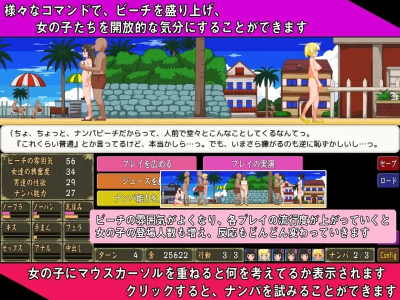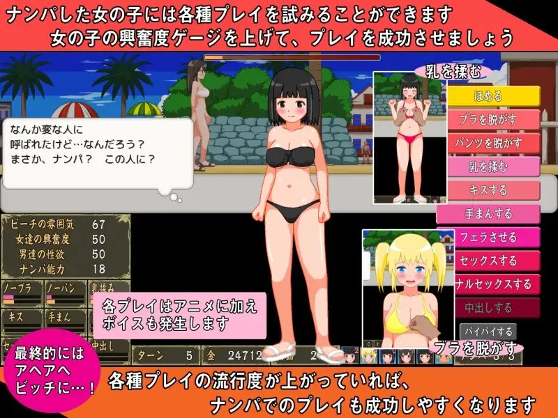 散播各种谣言、请炮友的风骚辣妹示范、举办活动,并且自己也去搭讪&游玩,来改变搭讪海滩的气氛,实现梦想吧。