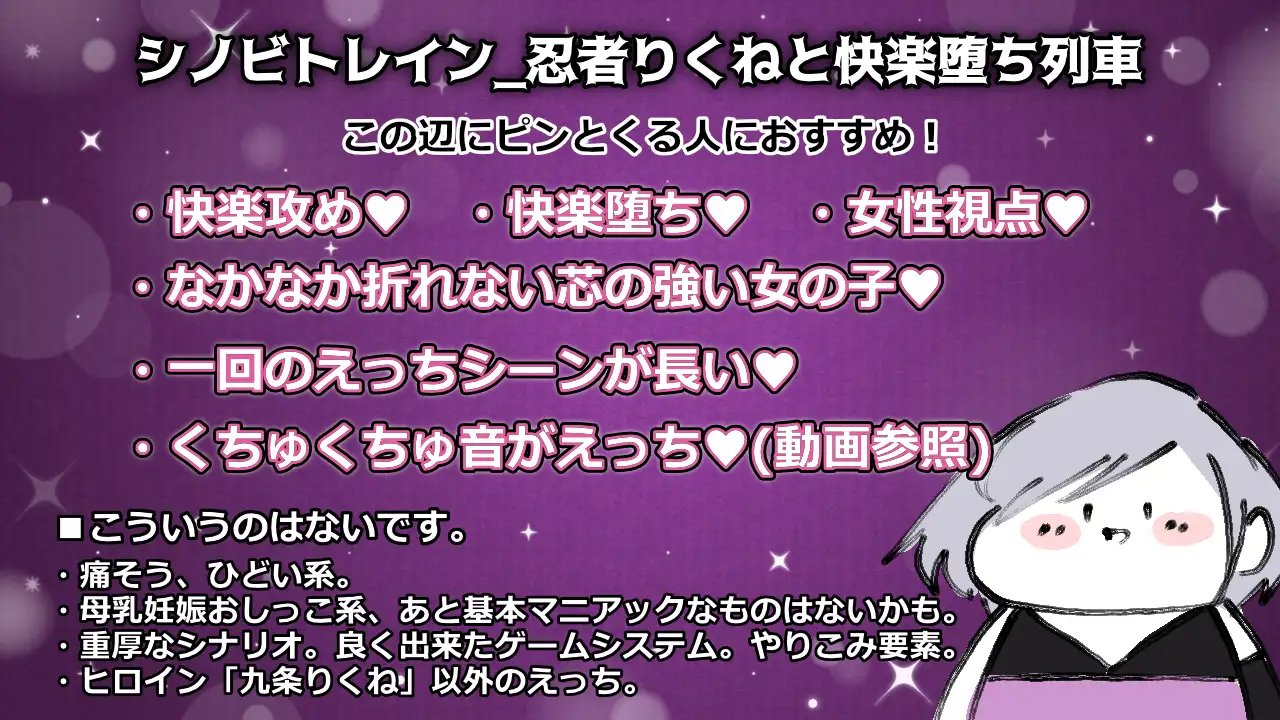 ■概要 在现代世界中,存在着“忍者”与“恶魔”。优秀的忍者“九条璃久音”为了讨伐恶魔而搭乘的电车上,遭遇了色情事件!