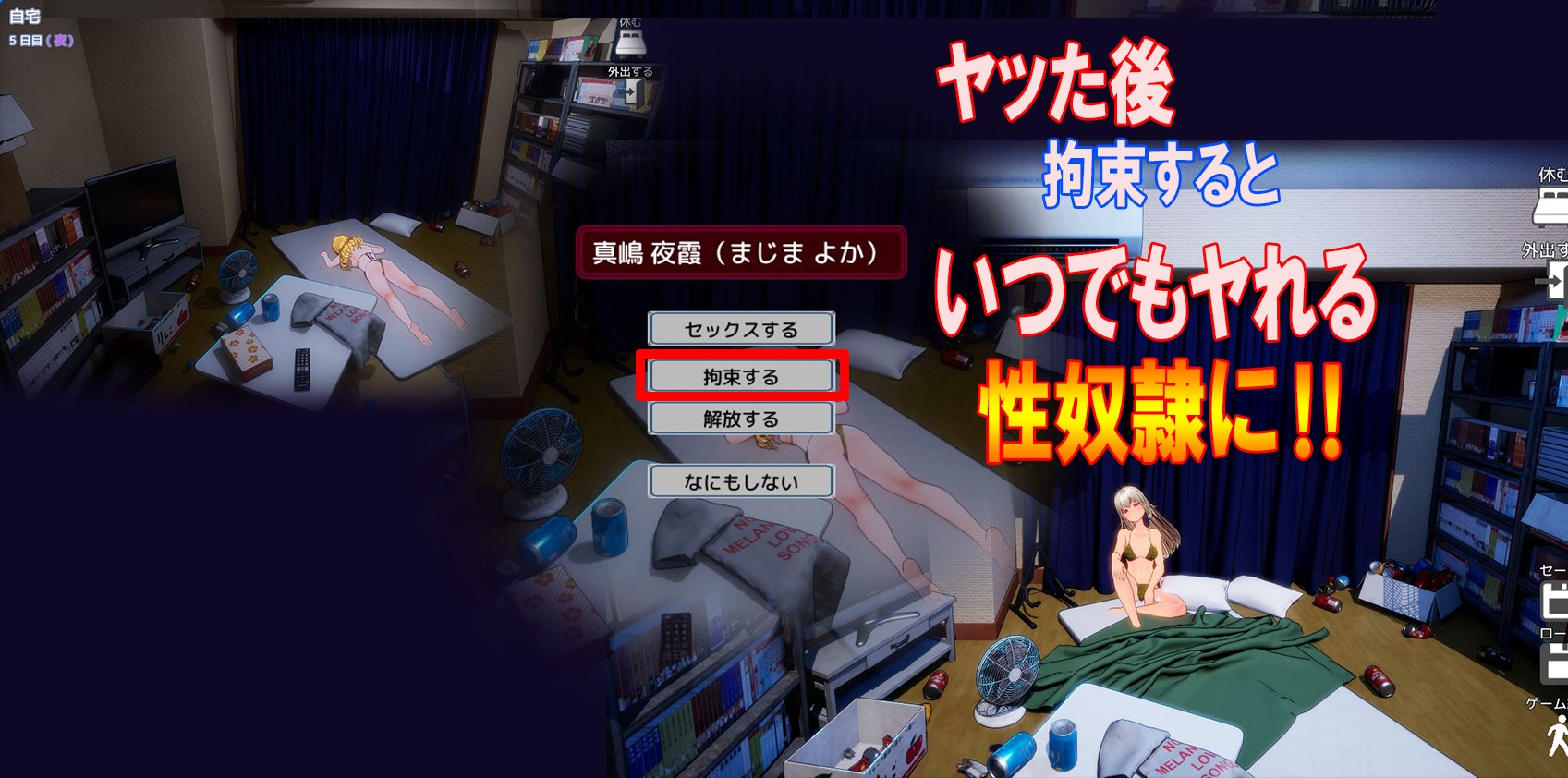 一旦你束缚住了女主角,她就会留在房间里,你可以随时进行性爱,而无需使用卡片!