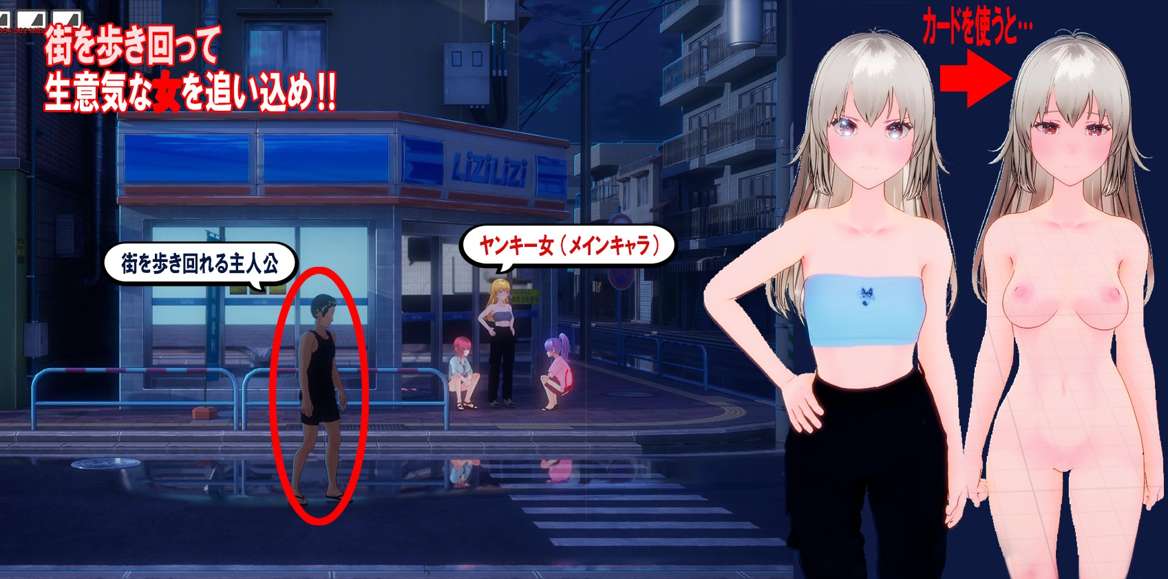 在这个游戏中,你会在早上、下午、傍晚漫步在城市中,接触多名女主角,并使用卡片羞辱她们。