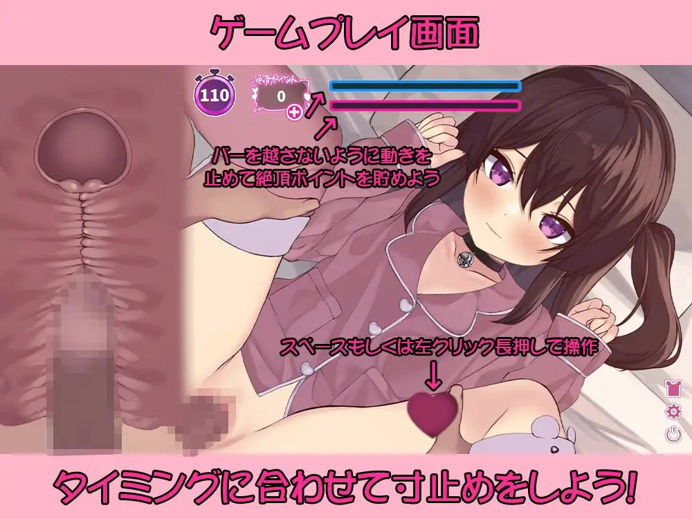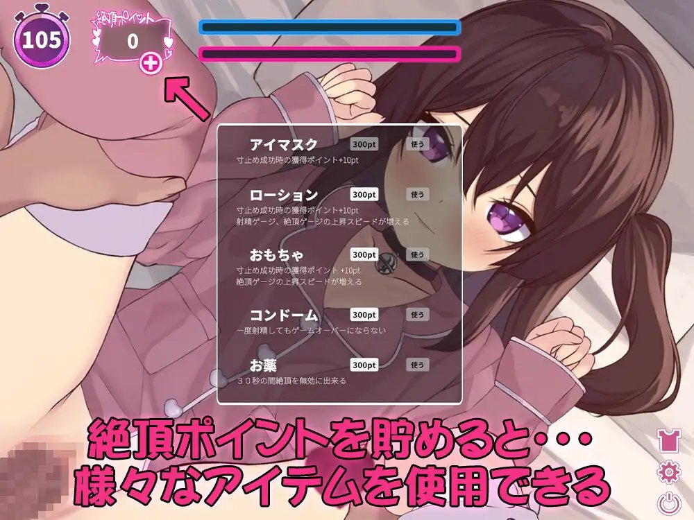 注意!如果能量條滿了就會遊戲結束。在累積高潮點數的同時,觀察她的反應,瞄準最佳時機完成最後的高潮吧!